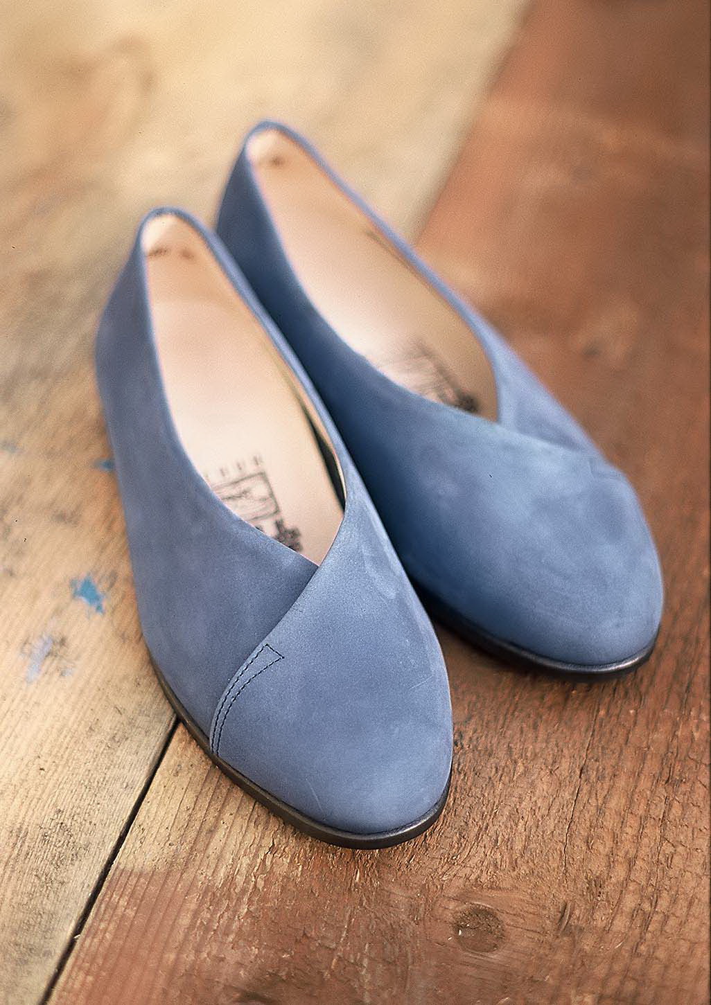 Leichter und robuster Ballerina in schlichter Form, asymmetrische Linienführung, aus kräftigem Rindnubukleder, mit Ledersohle und einem eingearbeitetem Korkfußbett. Das Fußbett unterstützt den Fuß bei langem Stehen und Gehen. Das feste Leder muss etwas eingelaufen werden. Nur noch Restbestände verfügbar.