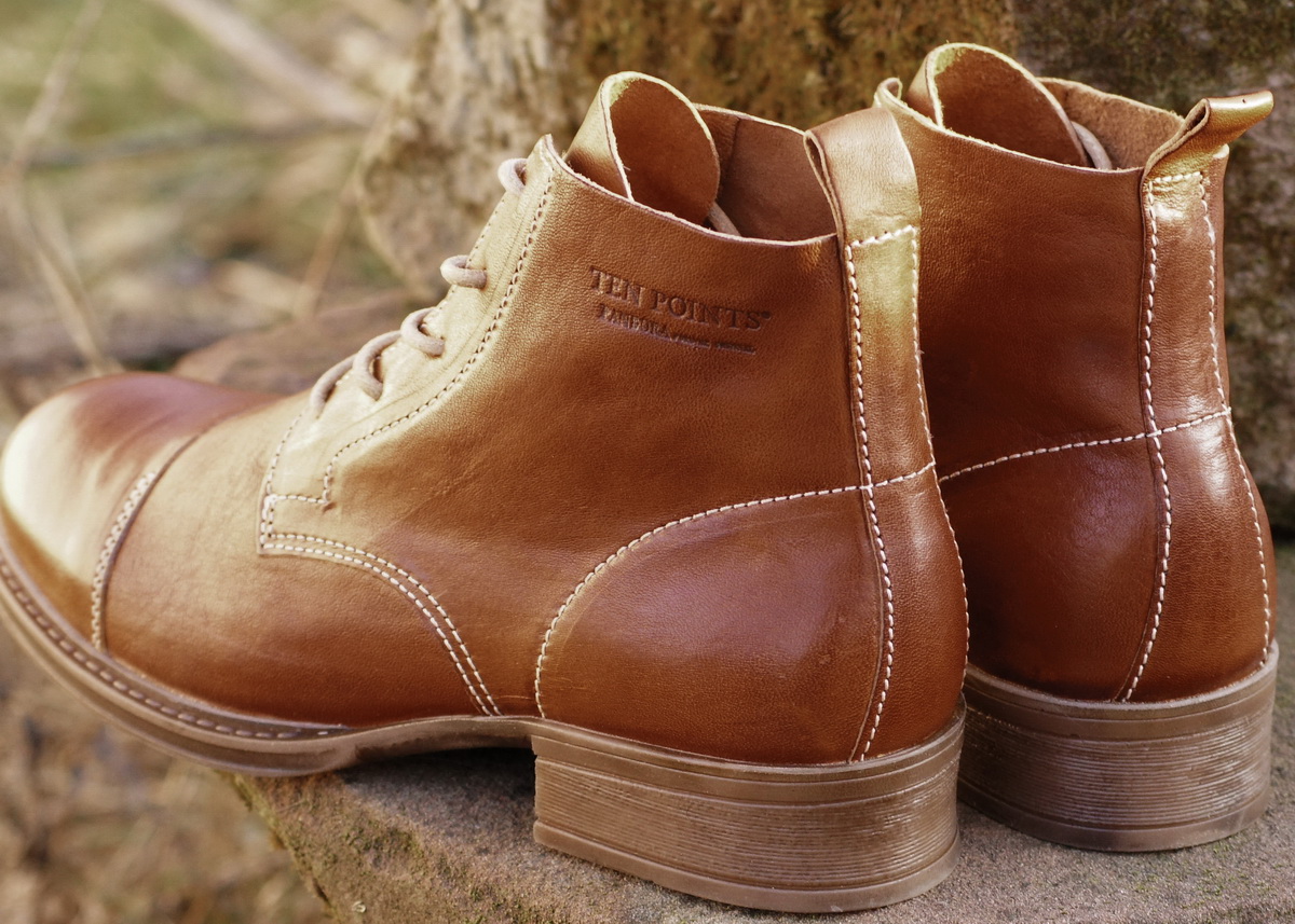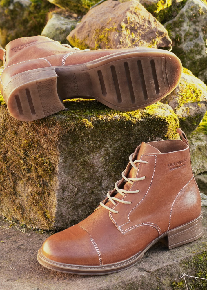 Chromfreie und ökologische Damenstiefelette Bequeme Schnür-Stiefelette mit guter Passform aus dem Ökosortiment von Ten Points. Auch mit dem aktuellen Herbstprogramm gelingt dem Label wieder sehr entspannt die Verbindung von eleganter Anmutung und nordischer Lässigkeit.Das Oberleder ist ein pflanzlich gegerbtes Glattleder, das für den besonderen Look von Struktur und Glanz in verschiedenen Techniken gewachst und gebürstet wird. Der Schaftrand ist gepolstert, innen sorgt ein atmungsaktives Futterleder für Wohlfühlklima im Schuh. Mit Reißverschluß für ein einfaches An- und Ausziehen. Die Innensohle ist herausnehmbar. Die elastische Laufsohle aus Gummi dämpft den Auftritt und gibt mit einem leichten Profil guten Halt.Ten Points-Schuhe werden in Schweden entworfen und nachhaltig und unter fairen Bedingungen in Portugal gefertigt.