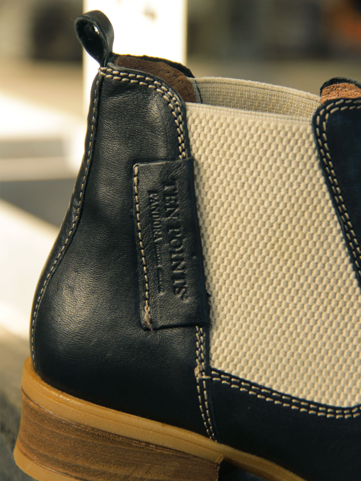 Naturgegerbte Chelsea-Stiefelette umweltfreundlich produziert Klare Linien, überzeugendes Design, hochwertiges Leder - ein perfekter Schuh für alle Tage. Die Chelsea-Stiefelette HEDDA aus dem Ökoprogramm von Ten Points beeindruckt durch den Kontrast von dunklem Leder mit feinen Kontrastnähten, hellen strukturierten Stretcheinsätzen und den warmen Brauntönen der Sohlen. Das weiche, pflanzlich gegerbte Leder ist sorgfältig verarbeitet und bekommt mit der Zeit eine schöne Patina. HEDDA hat eine rutschhemmende Gummi-Sohle mit einem etwa 3,5 cm hohen Absatz und ein weiches Innenfutter aus atmungsaktivem Leder, das für ein gutes Klima im Schuh sorgt. Ten Points Schuhe werden in Schweden entworfen und in Portugal fair und nachhaltig produziert. Das Label steht für hochwertige Schuhmacherkunst mit Tradition, verbindet Funktionalität mit viel Komfort und setzt auf langlebige Materialien.