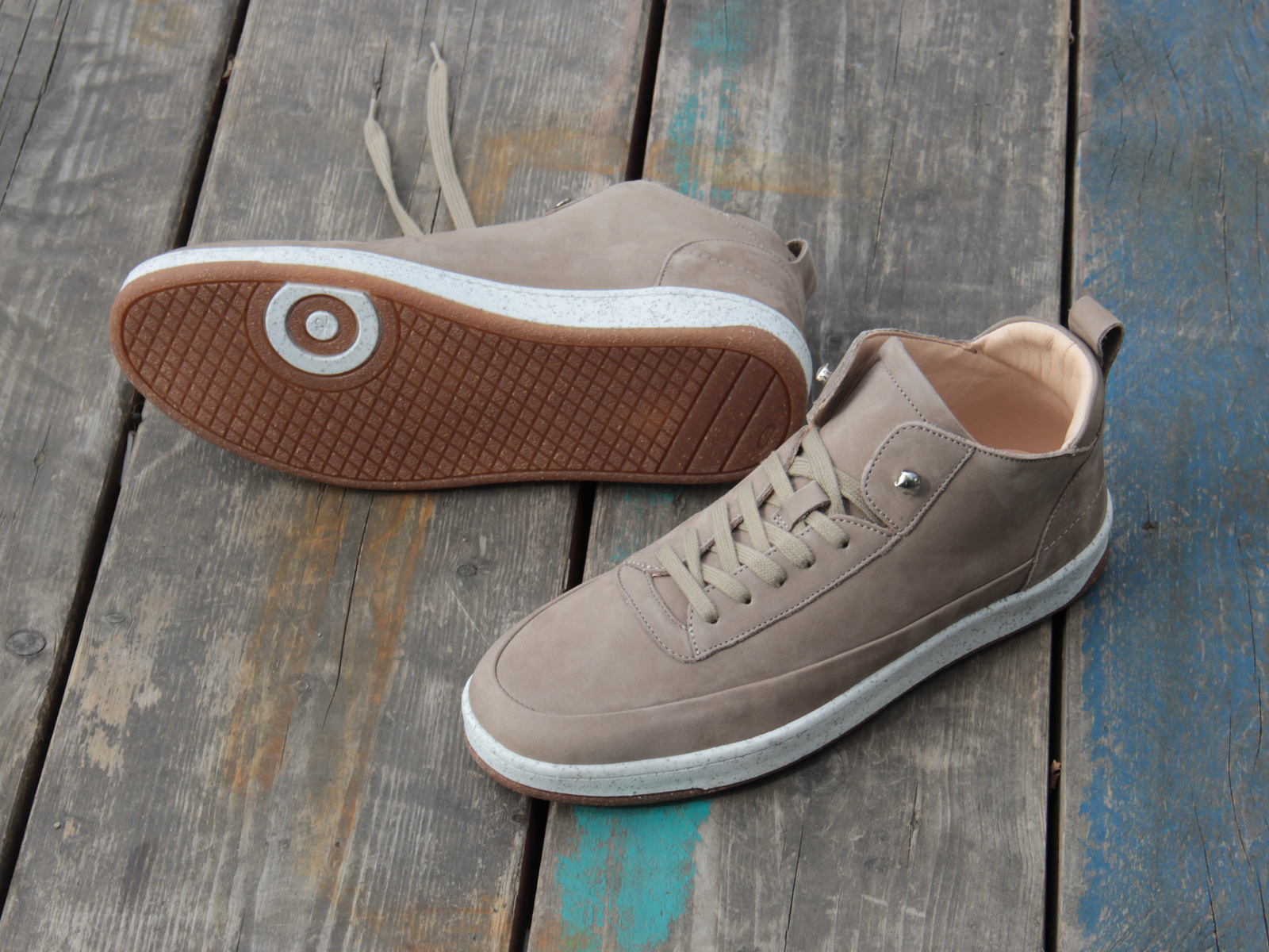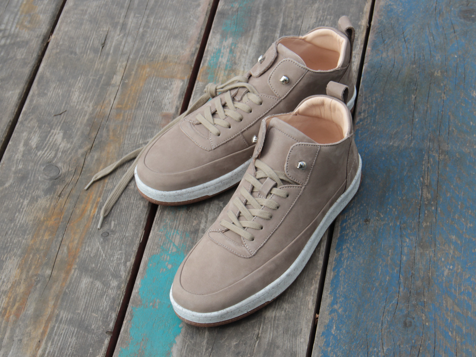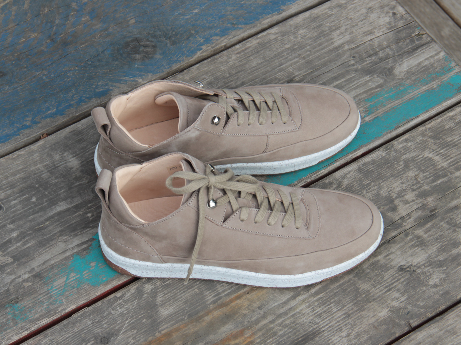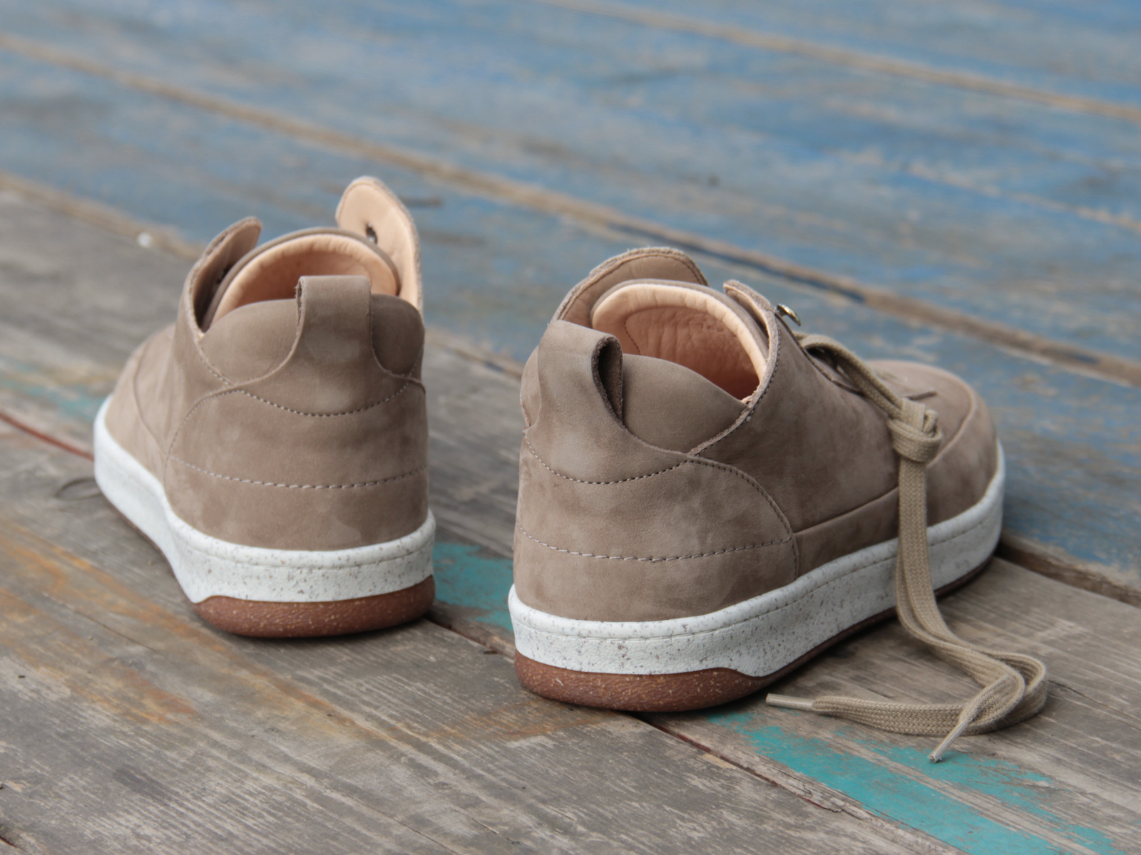 Das Oberleder ist ein Rindnubuk, innen ist der Schuh mit weichem Futterleder bezogen. Knöchelbereich, Zunge und die herausnehmbare Innensohle sind gepolstert. Im Fersenbereich ist Rauleder verarbeitet, wodurch der Schuh besonders gut am Fuß hält. Eine elastische Laufsohle aus recyceltem Thermokautschuk sorgt für einen weichen Auftritt. Die Farbe des Leders kann in Nuancen schwanken. Grund dafür ist die vegetabile Gerbung und die natürliche Verarbeitung.