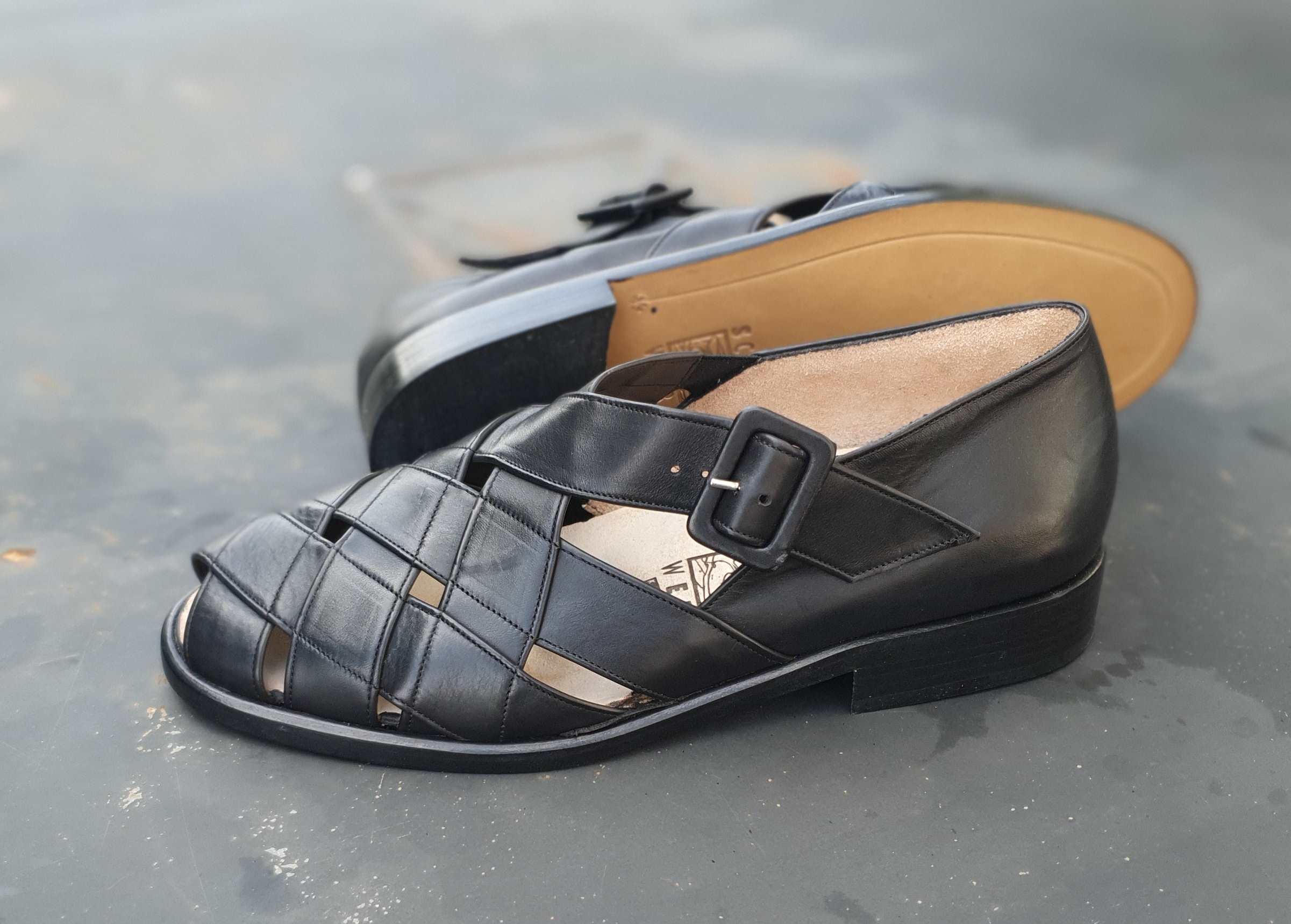 Schöne bequeme Sandale in Flechtoptik mit Schnalle, aus weichem Kalbnappaleder, mit Kalbleder gefüttert, einer leichten Ledersohle mit kleinem Holzabsatz und einem fest eingearbeitetem Korkfußbett.