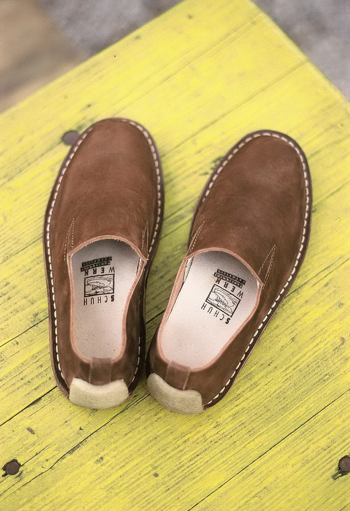 Durch einen eingearbeteten Gummizug passen sich die Schuhe optimal am Fuß an. Das Oberleder ist direkt auf die Leder-Zwischensohle aufgenäht - eine Verbindung, die lange hält, auch ganz ohne Klebstoff.